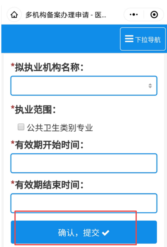 4、然后填寫業(yè)務(wù)信息,擬執(zhí)業(yè)機構(gòu)名稱、執(zhí)業(yè)范圍、有效期開始時間和有效期結(jié)束時間。填寫完成后,點擊“確認,提交”