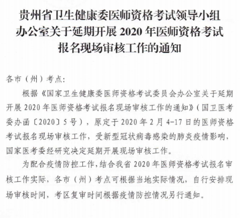貴州省2020年醫(yī)師資格考試報名現(xiàn)場審核時間延期通知