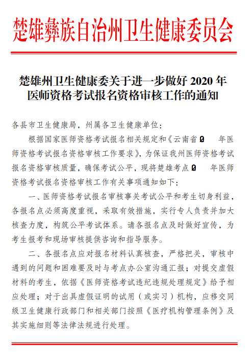 云南楚雄州2020年醫(yī)師資格考試報名資格審核工作的通知