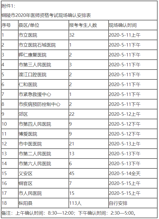 附件一、銅陵市2020年醫(yī)師資格考試現(xiàn)場確認(rèn)安排表