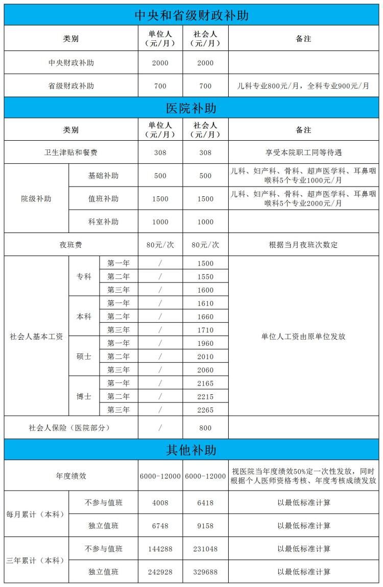 醫(yī)院對(duì)中央財(cái)政和省財(cái)政補(bǔ)助資金實(shí)行??顚S谩4_保了住院醫(yī)師規(guī)范化培訓(xùn)學(xué)員享受與本單位同等條件住院醫(yī)師同等待遇,具體補(bǔ)助標(biāo)準(zhǔn)如下: