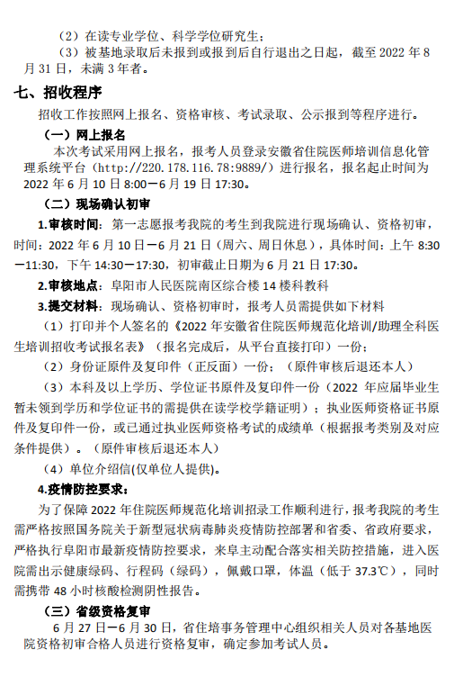以上就是“阜陽市人民醫(yī)院2022年住院醫(yī)師規(guī)范化培訓(xùn)招生簡章”的全部內(nèi)容,由醫(yī)學(xué)教育網(wǎng)小編整理,希望對(duì)您有所幫助!想要了解更多關(guān)于住院醫(yī)師規(guī)范化培訓(xùn)考試相關(guān)政策,請繼續(xù)關(guān)注此欄目!