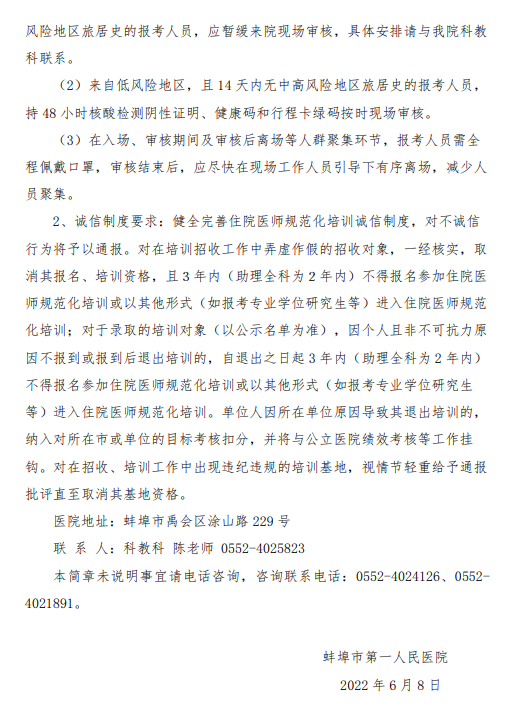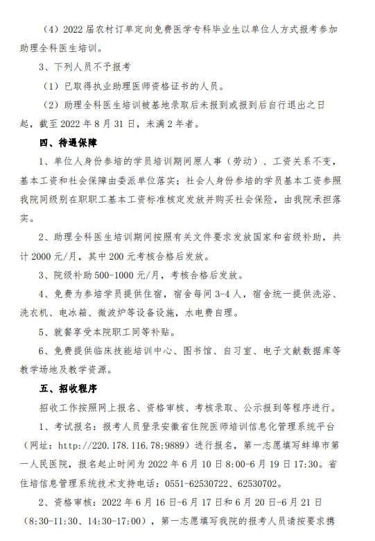 以上就是“蚌埠市第一人民醫(yī)院2022年住院醫(yī)師規(guī)范化培訓(xùn)招生簡章發(fā)布”的全部內(nèi)容,由醫(yī)學(xué)教育網(wǎng)小編整理,希望對您有所幫助!想要了解更多關(guān)于住院醫(yī)師規(guī)范化培訓(xùn)考試相關(guān)政策,請繼續(xù)關(guān)注此欄目!