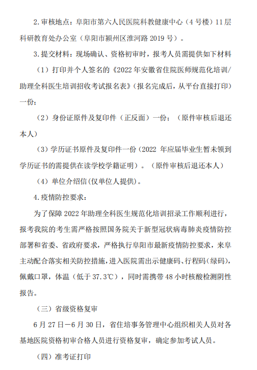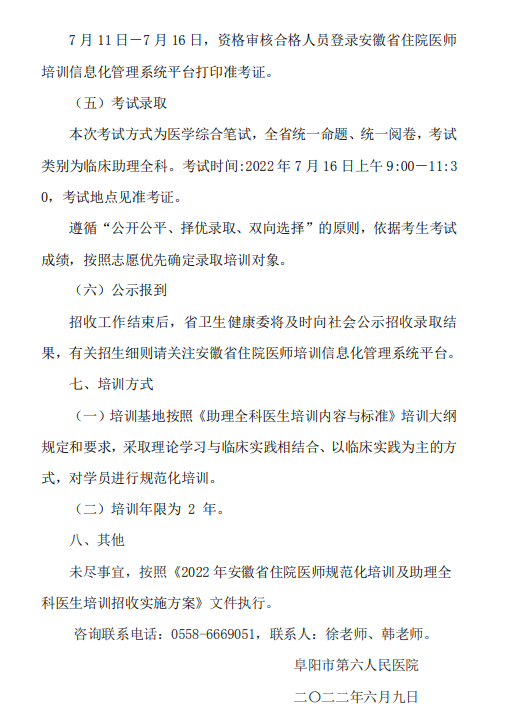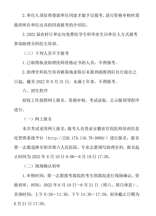 以上就是“阜陽市第六人民醫(yī)院2022年住院醫(yī)師規(guī)范化培訓招生簡章”的全部內(nèi)容,由醫(yī)學教育網(wǎng)小編整理,希望對您有所幫助!想要了解更多關于住院醫(yī)師規(guī)范化培訓考試相關政策,請繼續(xù)關注此欄目!