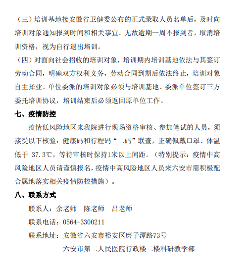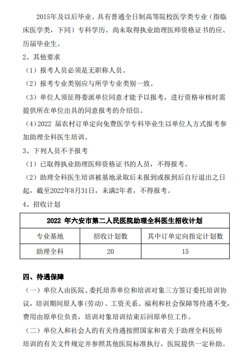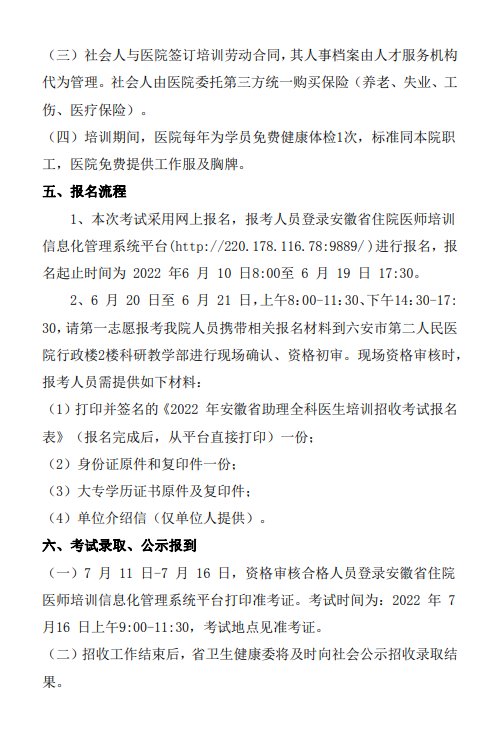 以上就是“六安市第二人民醫(yī)院2022年住院醫(yī)師規(guī)范化培訓招生簡章”的全部內(nèi)容,由醫(yī)學教育網(wǎng)小編整理,希望對您有所幫助!想要了解更多關(guān)于住院醫(yī)師規(guī)范化培訓考試相關(guān)政策,請繼續(xù)關(guān)注此欄目!