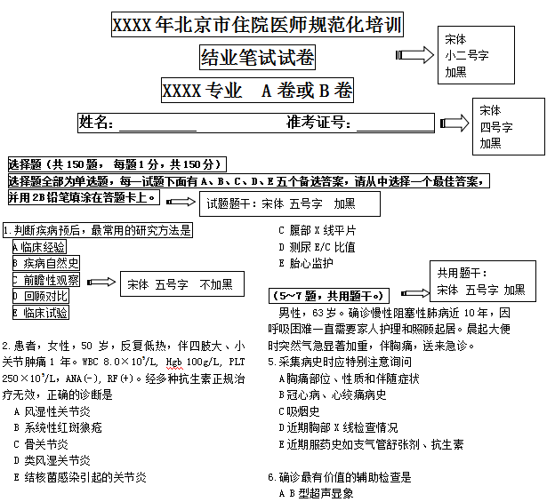 相信大家最近都在關(guān)注北京市住院醫(yī)師規(guī)范化培訓(xùn)結(jié)業(yè)考試的相關(guān)信息,下面請(qǐng)大家可以仔細(xì)查看醫(yī)學(xué)教育網(wǎng)編輯專門(mén)為您整理的,北京市住院醫(yī)師規(guī)范化培訓(xùn)結(jié)業(yè)考試-筆試試卷模板這篇文章吧。希望可以幫助到您!