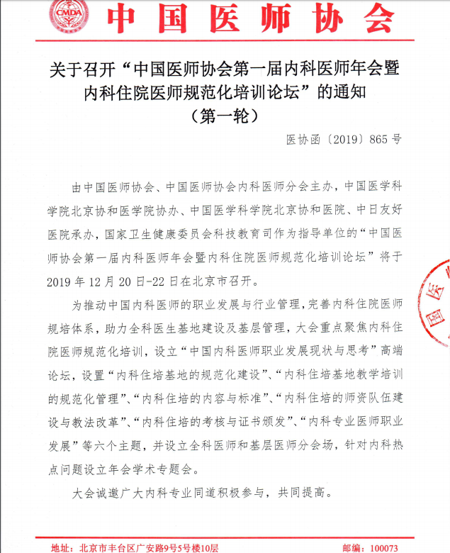 中國(guó)醫(yī)師協(xié)會(huì)第一屆內(nèi)科醫(yī)師年會(huì)暨內(nèi)科住院醫(yī)師規(guī)范化培訓(xùn)論壇將于2019年12月20日 ~ 12月22日在北京國(guó)際會(huì)議中心舉行,我們謹(jǐn)代表大會(huì)組委會(huì)向蒞臨本次會(huì)議的各位來(lái)賓、各位朋友表示誠(chéng)摯的歡迎!中國(guó)醫(yī)師協(xié)會(huì)內(nèi)科醫(yī)師分會(huì)于2019年4月成立。分會(huì)是由國(guó)內(nèi)權(quán)威臨床內(nèi)科專(zhuān)家組成的行業(yè)組織,是全國(guó)內(nèi)科醫(yī)師之家。分會(huì)肩負(fù)三大重要的使命:一是在政府的領(lǐng)導(dǎo)下,做好內(nèi)科住院醫(yī)師規(guī)范化培訓(xùn)(住培)工作;二是在內(nèi)科專(zhuān)業(yè)(Specialty)住培的基礎(chǔ)上,與有關(guān)專(zhuān)科(Subspecialty)醫(yī)師協(xié)會(huì)協(xié)同并開(kāi)展內(nèi)科專(zhuān)業(yè)下之專(zhuān)科醫(yī)師規(guī)范化培訓(xùn)工作;三是結(jié)合住培與專(zhuān)培工作,探討我國(guó)內(nèi)科醫(yī)師職業(yè)發(fā)展和行業(yè)管理。
