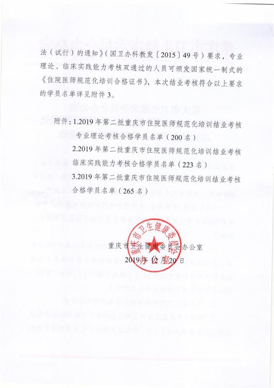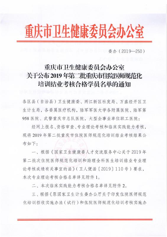 點(diǎn)擊下載附件:重慶市衛(wèi)生健康委員會辦公室關(guān)于公布2019年第二批重慶市住院醫(yī)師規(guī)范化培訓(xùn)結(jié)業(yè)考核合格學(xué)員名單的通知