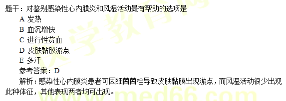 題干:女性,38歲,既往有風濕性心臟病病史,近2周有持續(xù)性發(fā)熱,全身乏力、食欲減退,經(jīng)檢查初步診斷為亞急性細菌性心內(nèi)膜炎,則在體格檢查中丕可能有