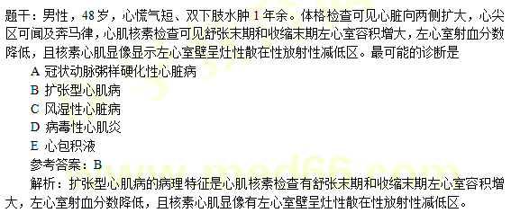解析:該患者應(yīng)首先考慮擴(kuò)張型心肌病,擴(kuò)張型心肌病最常見的死因為心力衰竭。