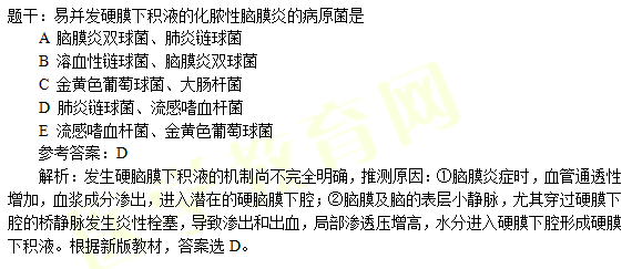 解析:化膿性腦膜炎懷疑合并硬膜下積液可通過顱透光檢查和CT掃描協(xié)助診斷,但最后確診是硬膜下穿刺放出積液,同時(shí)也可達(dá)到治療目的。積液應(yīng)送常規(guī)和細(xì)菌學(xué)檢查。