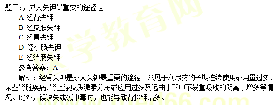 解析:機(jī)體排出水分的途徑有4個(gè),即消化道(糞)、皮膚(明顯出汗和不顯性出汗)、肺(呼出氣中水蒸氣)和腎(尿)。