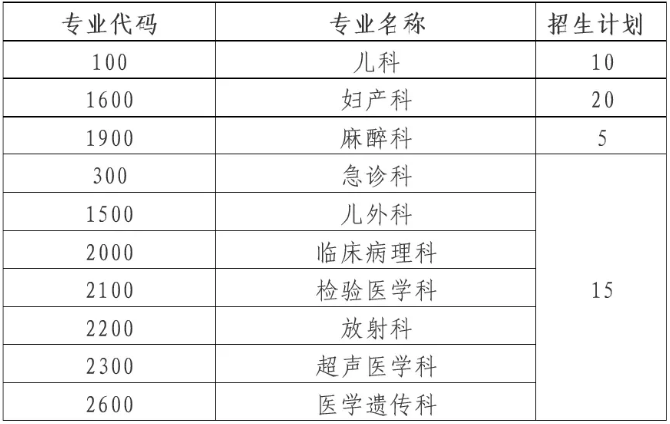 2019年住院醫(yī)師規(guī)范化培訓(xùn)招生專業(yè)包括婦產(chǎn)科、兒科、兒外科、醫(yī)學(xué)遺傳科、急診科、麻醉科、放射科、超聲醫(yī)學(xué)科、臨床病理科、檢驗(yàn)醫(yī)學(xué)科共計(jì)10個(gè),各專業(yè)培訓(xùn)補(bǔ)錄招生人數(shù)計(jì)劃如下,其中婦產(chǎn)科、兒科、麻醉科為緊缺專業(yè),可超額招生: