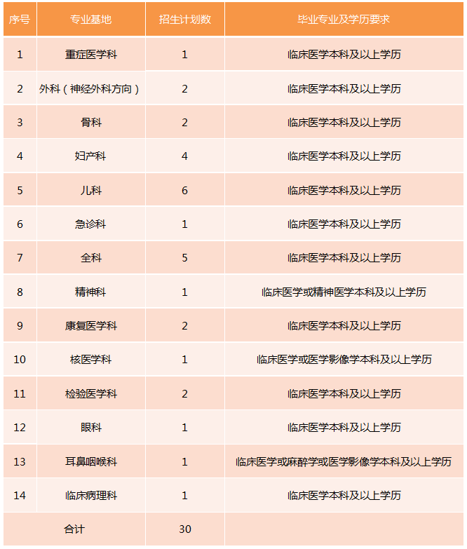 根據(jù)《住院醫(yī)師規(guī)范化培訓(xùn)管理辦法(試行)》精神,我院現(xiàn)面向社會(huì)計(jì)劃招收住院醫(yī)師規(guī)范化培訓(xùn)社會(huì)化學(xué)員30名,實(shí)際招收人數(shù)會(huì)根據(jù)具體情況適當(dāng)調(diào)整,招生計(jì)劃具體如下: