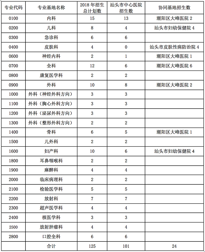 根據(jù)《廣東省衛(wèi)生計(jì)生委辦公室關(guān)于做好2018年住院醫(yī)師規(guī)范化培訓(xùn)招收工作的通知》(粵衛(wèi)辦函[2018]26號(hào))文件的精神要求,2018年我院(主基地)及協(xié)同單位計(jì)劃招收住院醫(yī)師規(guī)范化培訓(xùn)學(xué)員共125名,具體如下: