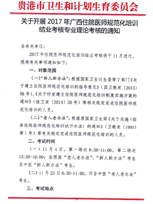 廣西貴港市2017年住院醫(yī)師規(guī)范化培訓(xùn)結(jié)業(yè)考核專業(yè)理論考核的通知已經(jīng)發(fā)布,考試時(shí)間為11月4日和11月25日兩天,考生根據(jù)如下通知進(jìn)行進(jìn)行準(zhǔn)備,醫(yī)學(xué)教育網(wǎng)整理相關(guān)內(nèi)容如下: