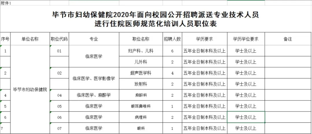 招聘職位詳見《畢節(jié)市婦幼保健院2020年面向校園公開招聘派送專業(yè)技術(shù)人員進(jìn)行住院醫(yī)師規(guī)范化培訓(xùn)人員職位表》(以下簡稱《職位表》,附件1)。