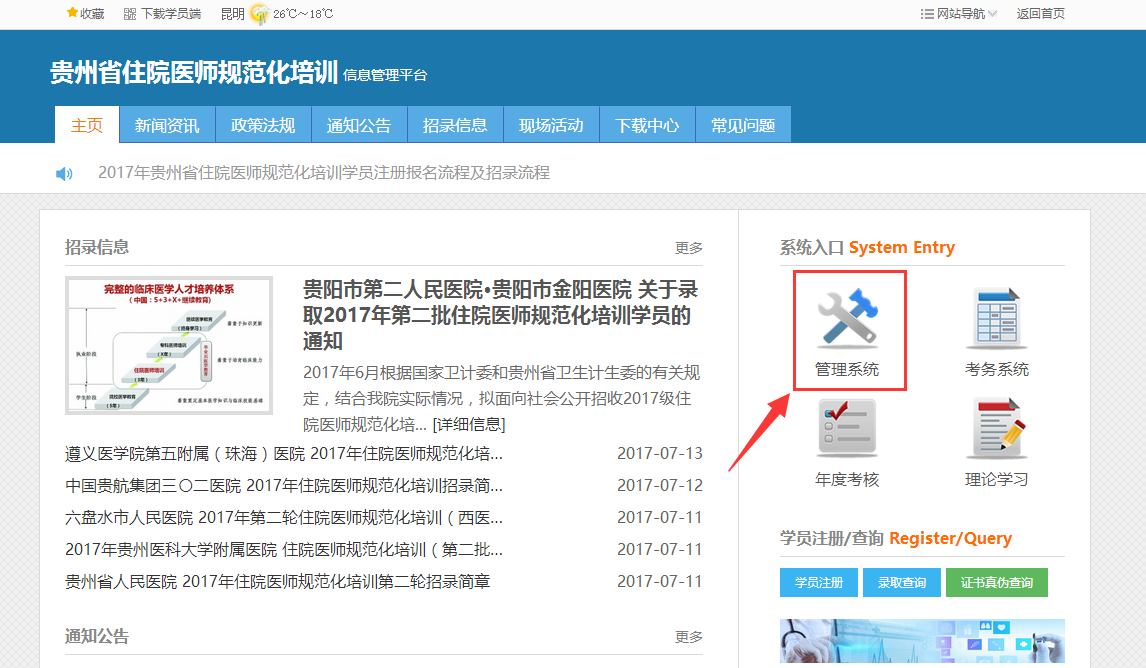 1.學(xué)員在瀏覽器地址欄輸入:http://gzgp.yiboshi.com/進(jìn)入貴州省住院醫(yī)師規(guī)范化培訓(xùn)信息管理平臺(tái),如下圖。