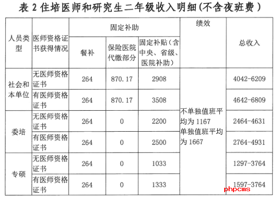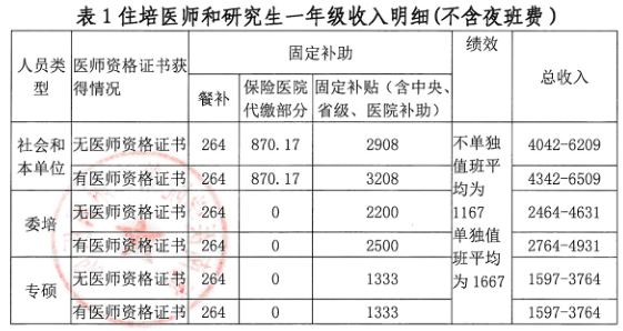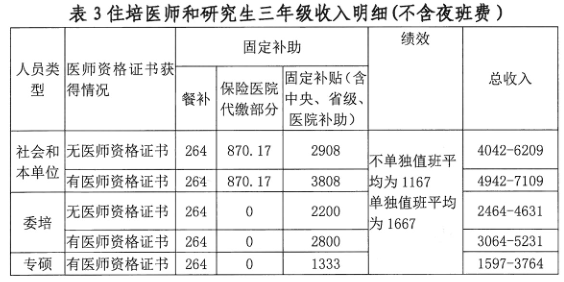 我院住培醫(yī)師待遇包括固定補(bǔ)助、績(jī)效補(bǔ)助、五項(xiàng)保險(xiǎn)、晚夜班費(fèi)、工作餐補(bǔ)助等。住院醫(yī)師在我院總收入會(huì)體現(xiàn)多勞多得,每月總收入4000元至8000元不等,,已經(jīng)獲得碩士學(xué)位住培醫(yī)師固定補(bǔ)助增加500元/月。詳見(jiàn)表1-3。