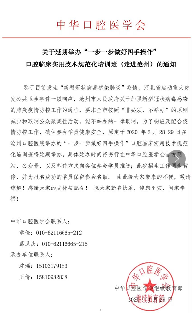 “一步一步做好四手操作”口腔臨床實用技術(shù)規(guī)范化培訓(xùn)班(走進滄州)延期舉行的通知,具體內(nèi)容如下,希望能夠幫助到您!