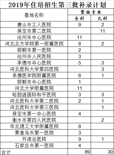 2019年河北住培招生第三批補(bǔ)錄計(jì)劃已公布,其中緊缺專業(yè):全科補(bǔ)錄80人,兒科補(bǔ)錄30人,具體各醫(yī)院招錄指標(biāo)詳見下表: