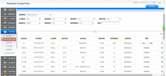 二、打開(kāi)左側(cè)菜單欄選擇學(xué)員管理-往屆學(xué)員審核(如下圖),此時(shí)如無(wú)學(xué)員信息則為學(xué)員未注冊(cè),請(qǐng)聯(lián)系學(xué)員重新注冊(cè)完成注冊(cè)后即可正常顯示。