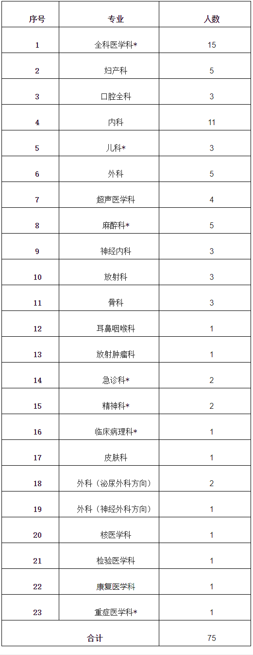 2021年我院擬招錄75名住院醫(yī)師(不含2021年專碩研究生)。優(yōu)先招錄全科、兒科、精神科、婦產(chǎn)科、麻醉科、重癥醫(yī)學(xué)科、急診科、病理科等專業(yè)。招生計(jì)劃見下表: