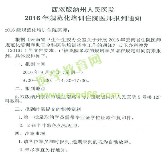 醫(yī)學(xué)教育網(wǎng)小編整理了云南西雙版納州人民醫(yī)院2016年規(guī)范化培訓(xùn)住院醫(yī)師報(bào)到通知,具體內(nèi)容如下: