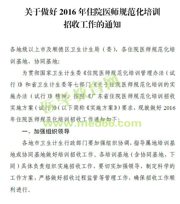 醫(yī)學(xué)教育網(wǎng)小編整理了關(guān)于做好廣東省2016年住院醫(yī)師規(guī)范化培訓(xùn)招收工作的通知,具體內(nèi)容如下: