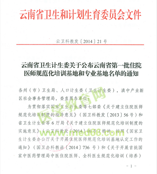 醫(yī)學(xué)教育網(wǎng)小編整理了云南省第一批住院醫(yī)師規(guī)范化培訓(xùn)基地和專業(yè)基地名單,具體內(nèi)容如下: