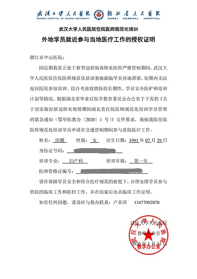 武漢大學(xué)人民醫(yī)院根據(jù)湖北省畢業(yè)后醫(yī)學(xué)教育委員會(huì)辦公室的“關(guān)于切實(shí)做好新冠肺炎疫情期間湖北省住院醫(yī)師規(guī)范化培訓(xùn)學(xué)員管理的緊急通知”( 鄂畢醫(yī)教辦〔2020〕1號(hào))文件精神,在綜合考慮到疫情防控長(zhǎng)期性、學(xué)員安全防護(hù)和培訓(xùn)計(jì)劃要求等情況后,于2020年1月30日起,對(duì)主動(dòng)申請(qǐng)參與當(dāng)?shù)匾咔榉揽毓ぷ鞯?7名滯留外地住培學(xué)員,在保障學(xué)員安全和符合培訓(xùn)要求的前提下,臨時(shí)出具相關(guān)證明授權(quán)學(xué)員參與當(dāng)?shù)蒯t(yī)療機(jī)構(gòu)的疫情防控工作。