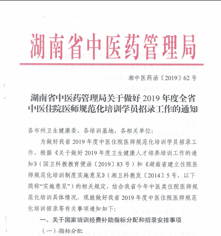 湖南省中醫(yī)藥管理局關(guān)于做好2019年度全省中醫(yī)住院醫(yī)師規(guī)范化培訓(xùn)學(xué)員招錄工作的通知