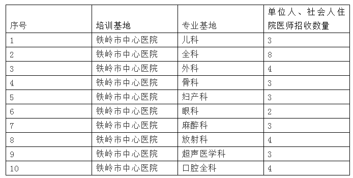 可報考鐵嶺市中心醫(yī)院外科、全科、骨科、婦產(chǎn)科、兒科、口腔、眼科、麻醉科、超聲科、放射科10個專業(yè)基地,各專業(yè)基地招生容量見(附表1)。