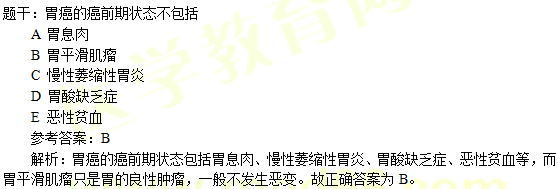 解析:目前認為,食管癌前病變有Bar-rett食管、食管上皮增生和食管黏膜炎癥,故正確答案為D,其他備選答案均為食管的癌前疾病。