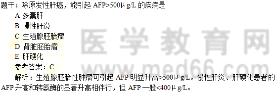 解析:AFP是原發(fā)性肝細(xì)胞肝癌的最靈敏、最特異的腫瘤標(biāo)志。除AFP陰性肝癌外,若AFP小于20μg/L,原發(fā)性肝癌基本不可能;AFP在100~300μg/L之間者必須進(jìn)行隨訪,密切觀察AFP的動(dòng)態(tài)變化,注意可能的小肝癌AFP在350~500μg/L,或含量明顯增高者,必須參考其他檢查,應(yīng)高度警惕原發(fā)性肝癌的可能;AFP為500~100Oμg/L,且含量在短期內(nèi)不斷升高,原發(fā)性肝癌可能性很大,建議活檢;AFP大于100Oμg/L者,甚至在近期內(nèi)AFP含量迅速升高,則原發(fā)性肝癌診斷基本可確定。