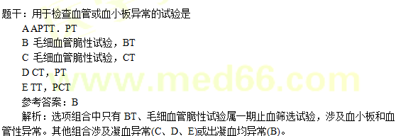 解析:解析:原發(fā)性血小板減少性紫癜的特點是血小板減少,因此可使BT延長,因無凝血障礙和繼發(fā)纖溶異常,所以其余4項均不正確。