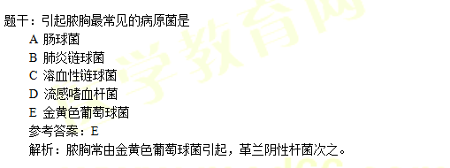 解析:病原為金黃色葡萄球菌(金葡菌)。由呼吸道入侵或經(jīng)血行播散入肺。新生兒、嬰幼兒發(fā)病率高,由于濫用抗生素致耐藥性金葡菌株明顯增加,加上小兒免疫功能低下,故易發(fā)生。病理改變以肺組織廣泛出血性壞死和多發(fā)性小膿腫形成為特點。由于病變發(fā)展迅速,組織破壞嚴(yán)重,故易形成肺膿1腫、膿胸、膿氣胸、肺大泡、皮下氣腫、縱隔氣腫。
