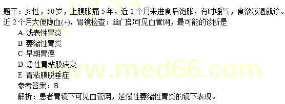解析:慢性萎縮性胃炎常伴有腸上皮化生,可以逐漸演變?yōu)楫愋驮錾?,出現(xiàn)癌變,故老年萎縮性胃炎病人.出現(xiàn)消瘦應警惕胃癌的發(fā)生。