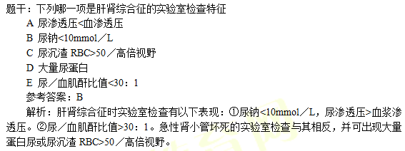 解析:肝腎綜合征時腎小管重吸收鈉的功能正常,此時常有腎素一血管緊張素一醛固酮系統(tǒng)(RAAS)、交感神經(jīng)系統(tǒng)(sNs)的明顯激活,腎小管鈉重吸收增加,尿鈉減少。此時,腎小球濾過率下降使鈉濾過減少也可使尿鈉減少。因此肝腎綜合征時常有低尿鈉。而氮質血癥、稀釋性低血鈉、少尿、高鉀血癥在急性腎小管壞死(ATN)等腎器質性病變中均可出現(xiàn),ATN時腎小管重吸收鈉的功能減弱,尿鈉增加。