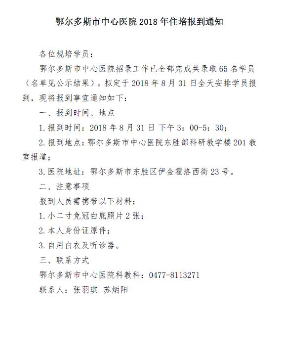 2018年內(nèi)蒙古鄂爾多斯市中心醫(yī)院住院醫(yī)師規(guī)范化培訓(xùn)報到通知已經(jīng)公布了,為了幫助大家及時了解,醫(yī)學(xué)教育網(wǎng)整理以下內(nèi)容,請參考: