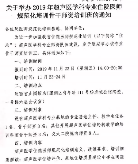 2019年超聲醫(yī)學科專業(yè)住院醫(yī)師規(guī)范化培訓骨干師資培訓班舉辦的通知,具體內(nèi)容如下,希望能夠幫助到您!