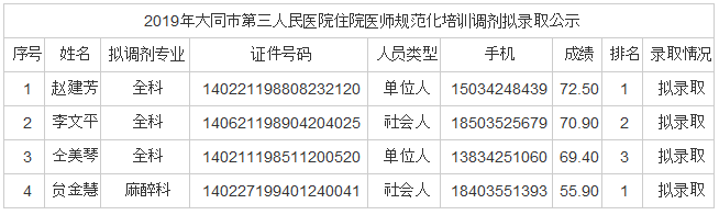 山西省衛(wèi)生健康委員會(huì)發(fā)布2019年大同市第三人民醫(yī)院住院醫(yī)師規(guī)范化培訓(xùn)調(diào)劑擬錄取公示通知,為幫助大家了解,醫(yī)學(xué)教育網(wǎng)小編為您整理解答相關(guān)通知如下: