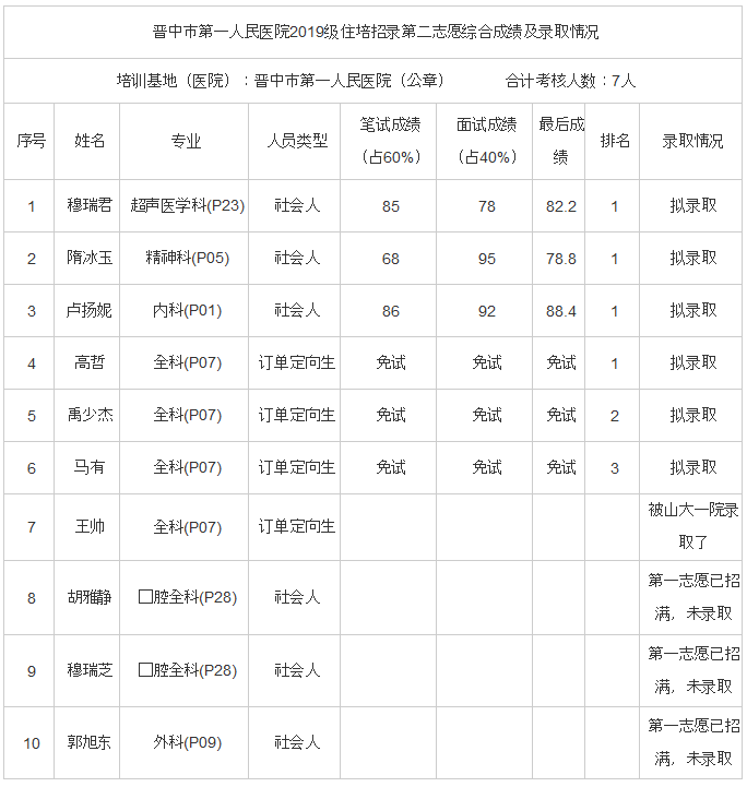晉中市第一人民醫(yī)院2019級住培招錄第二志愿綜合成績及錄取情況發(fā)布啦!很多朋友對此非常關注,醫(yī)學教育網小編專門為大家搜集整理了如下內容,希望可以有所幫助。