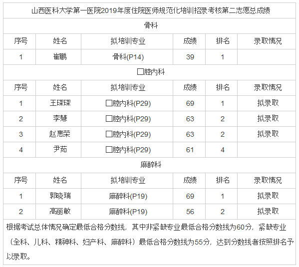 山西醫(yī)科大學(xué)第一醫(yī)院2019年度住院醫(yī)師規(guī)范化培訓(xùn)招錄考核第二志愿總成績發(fā)布啦!很多朋友對此非常關(guān)注,醫(yī)學(xué)教育網(wǎng)小編專門為大家搜集整理了如下內(nèi)容,希望可以有所幫助。