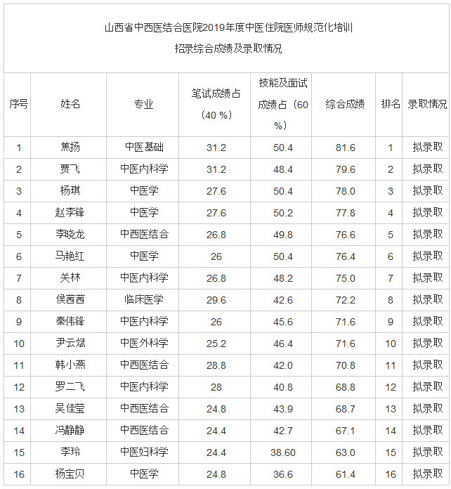 山西省中西醫(yī)結合醫(yī)院2019年度中醫(yī)住院醫(yī)師規(guī)范化培訓 招錄綜合成績及錄取情況發(fā)布啦!很多朋友對此非常關注,醫(yī)學教育網小編專門為大家搜集整理了如下內容,希望可以有所幫助。