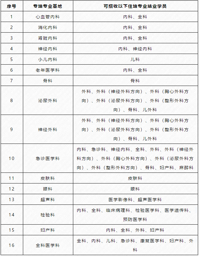 2020年度省級??漆t(yī)師規(guī)范化培訓招收專業(yè)共19個,*為國家重點學科,如下表,每專業(yè)預計招收社會化學員和外單位送培學員共約2—3人。