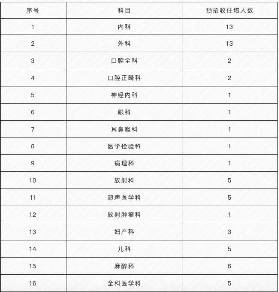 招生專業(yè):內(nèi)、外、婦、兒、全科醫(yī)學(xué)、口腔全科、口腔正畸、檢驗醫(yī)學(xué)、超聲醫(yī)學(xué)、放射、麻醉醫(yī)學(xué)、病理、眼科、耳鼻咽喉科、放射腫瘤科、神經(jīng)內(nèi)科和助理全科 17 個專業(yè)。
