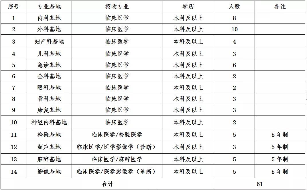 全日制臨床醫(yī)學(xué)本科及本科以上畢業(yè)生。本科生不超過(guò)28周歲;研究生不超過(guò)35周歲。報(bào)考全科醫(yī)學(xué)專(zhuān)業(yè)者,本科生年齡放寬至30周歲,具有博士學(xué)歷者可放寬至38周歲招收專(zhuān)業(yè)及招生人數(shù)參見(jiàn)我院“2020年住院醫(yī)師培訓(xùn)招生計(jì)劃”。具體名額如下: