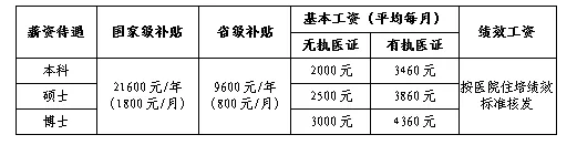 ①部分提供院內(nèi)住宿(獨立衛(wèi)生間、3人/間、上床下桌、優(yōu)惠政策100元/月/人、水電費自理);②購買五險一金,購買基數(shù)及標(biāo)準(zhǔn)同本院醫(yī)師;③薪資待遇(見下表)。