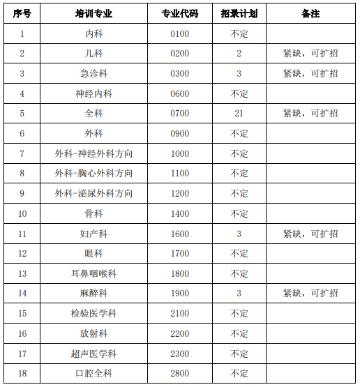 招收以下公布的 19 個(gè)培訓(xùn)專(zhuān)業(yè)。重點(diǎn)向全科、兒科、婦產(chǎn)科、麻醉科、急診科、重癥醫(yī)學(xué)科等緊缺專(zhuān)業(yè)傾斜。